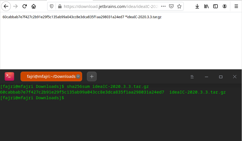 Setelah memahami definisi checksum dan bagaimana ia dapat digunakan untuk memeriksa integritas sebuah data, maka sekarang kita lanjutkan untuk melakukan pemeriksaan checksum dari sebuah file. Sebagai contoh file yang digunakan adalah program aplikasi IntellijIDEA dengan nama file ideaIC-2020.3.3.tar.gz.